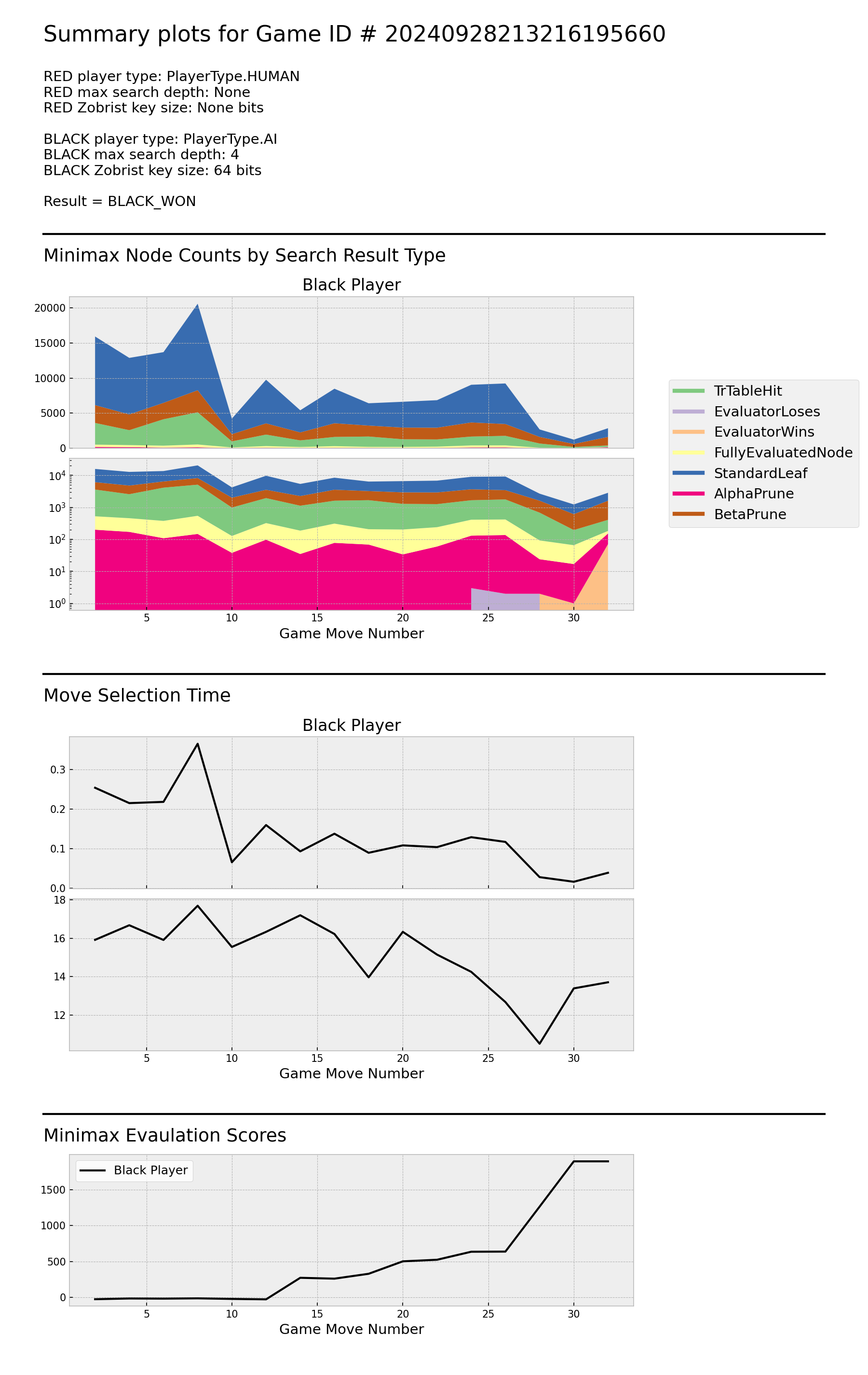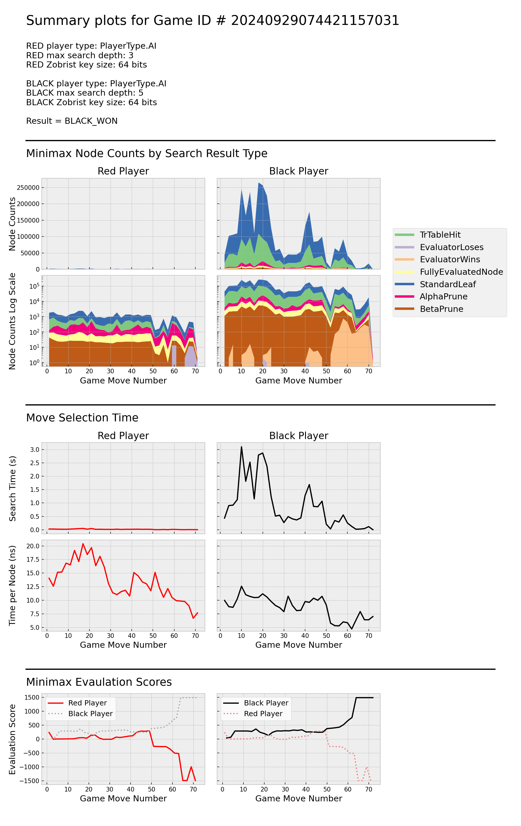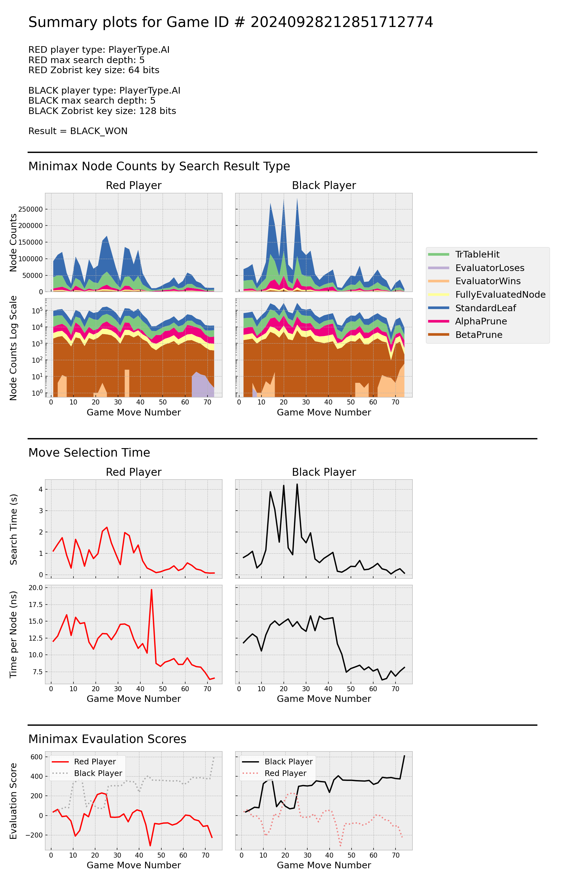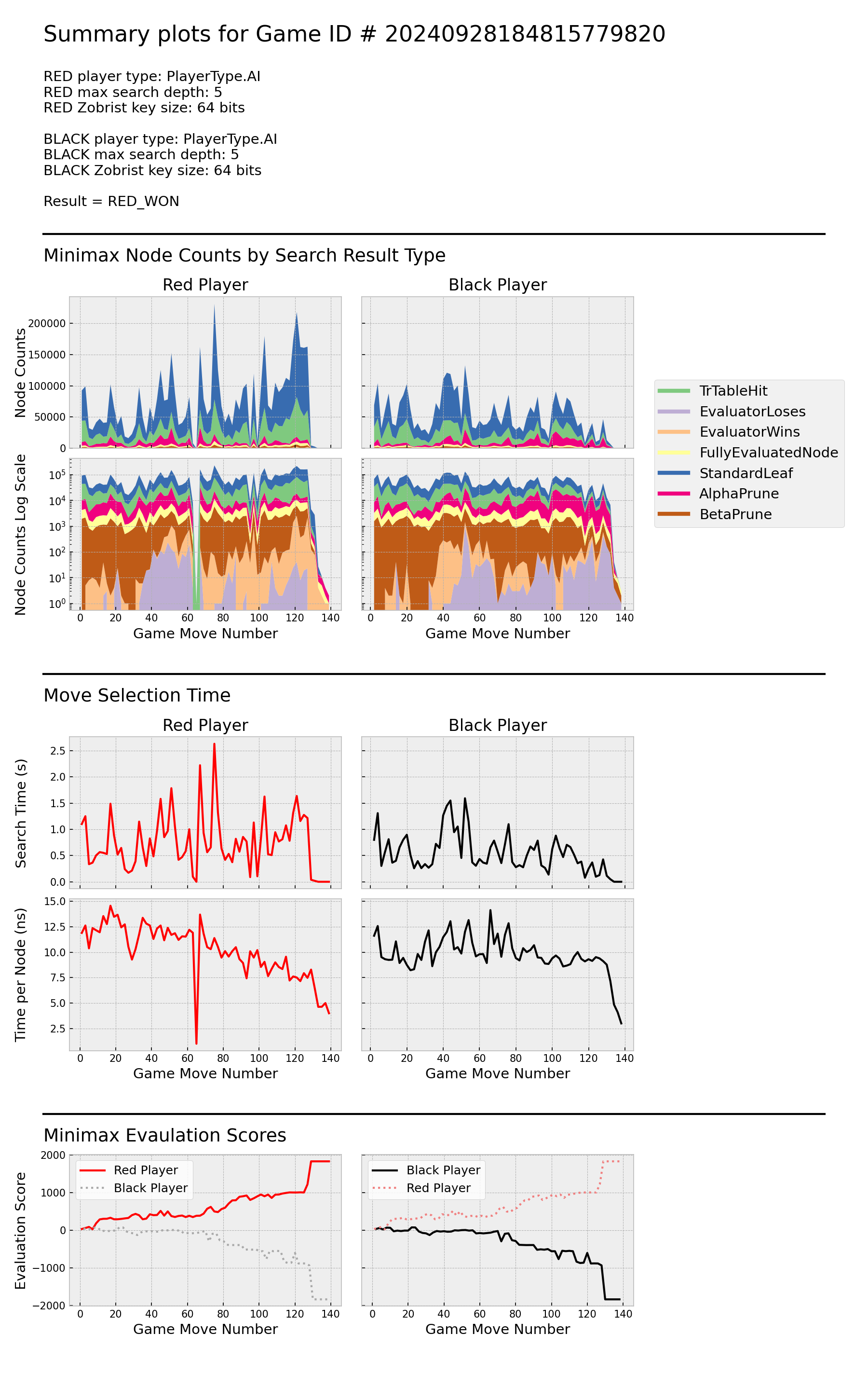 Red establishes an advantage early, and maintains it throughout the game. During searches for moves ~ 40 - 60, both players detect ~100 leaf nodes with Red losing, but Red is able to prevent actual game moves from going down these paths. Around move 65, Red discovers a transposition table hit in the root node, resulting very low search time. Red's search time per node trends downward throughout the game as its ratio of transposition table hits to standard leaves increases. Search time per node for both players drops sharply in the final ~10 moves, likely due to discovery of shallow end-of-game leaves.