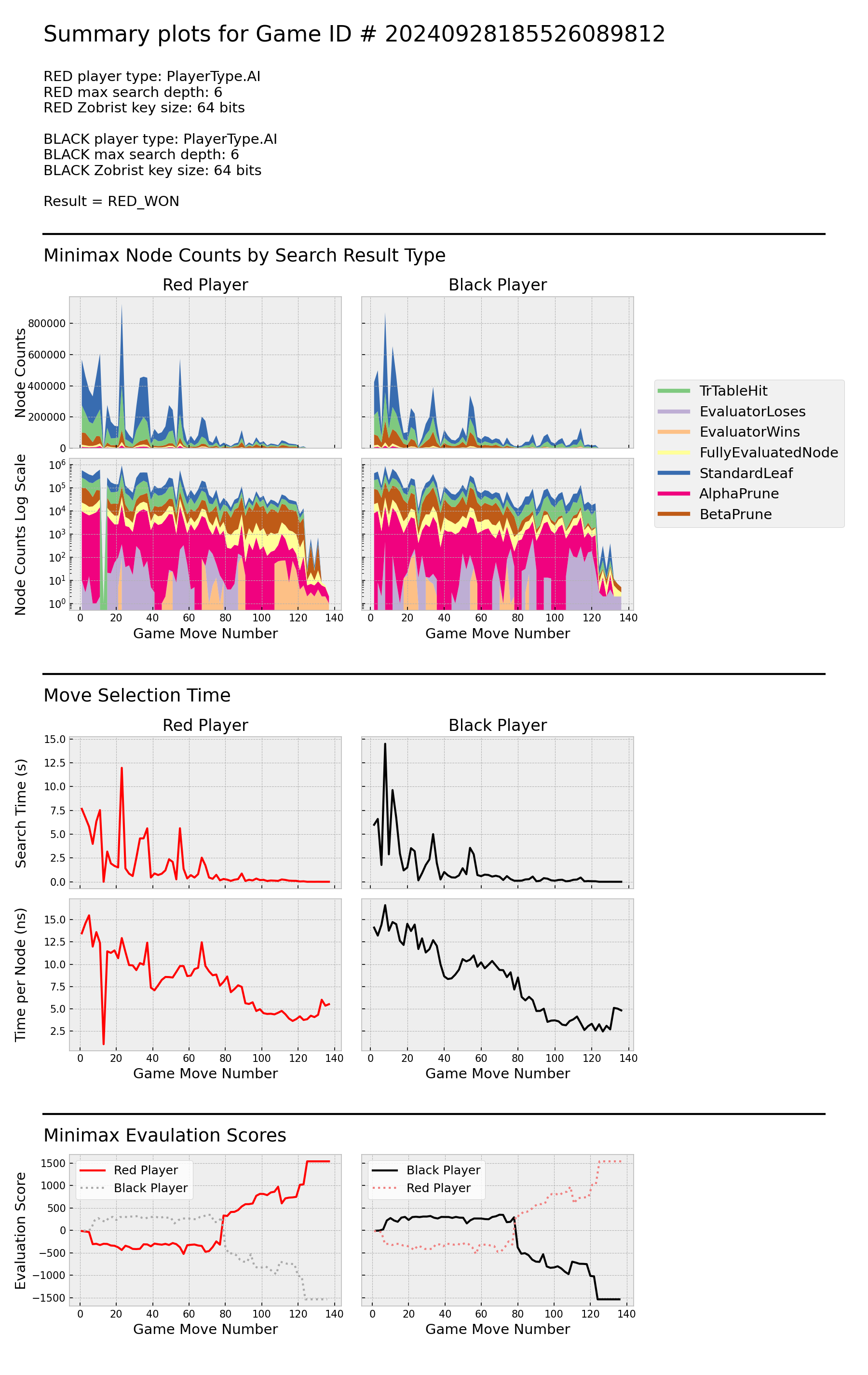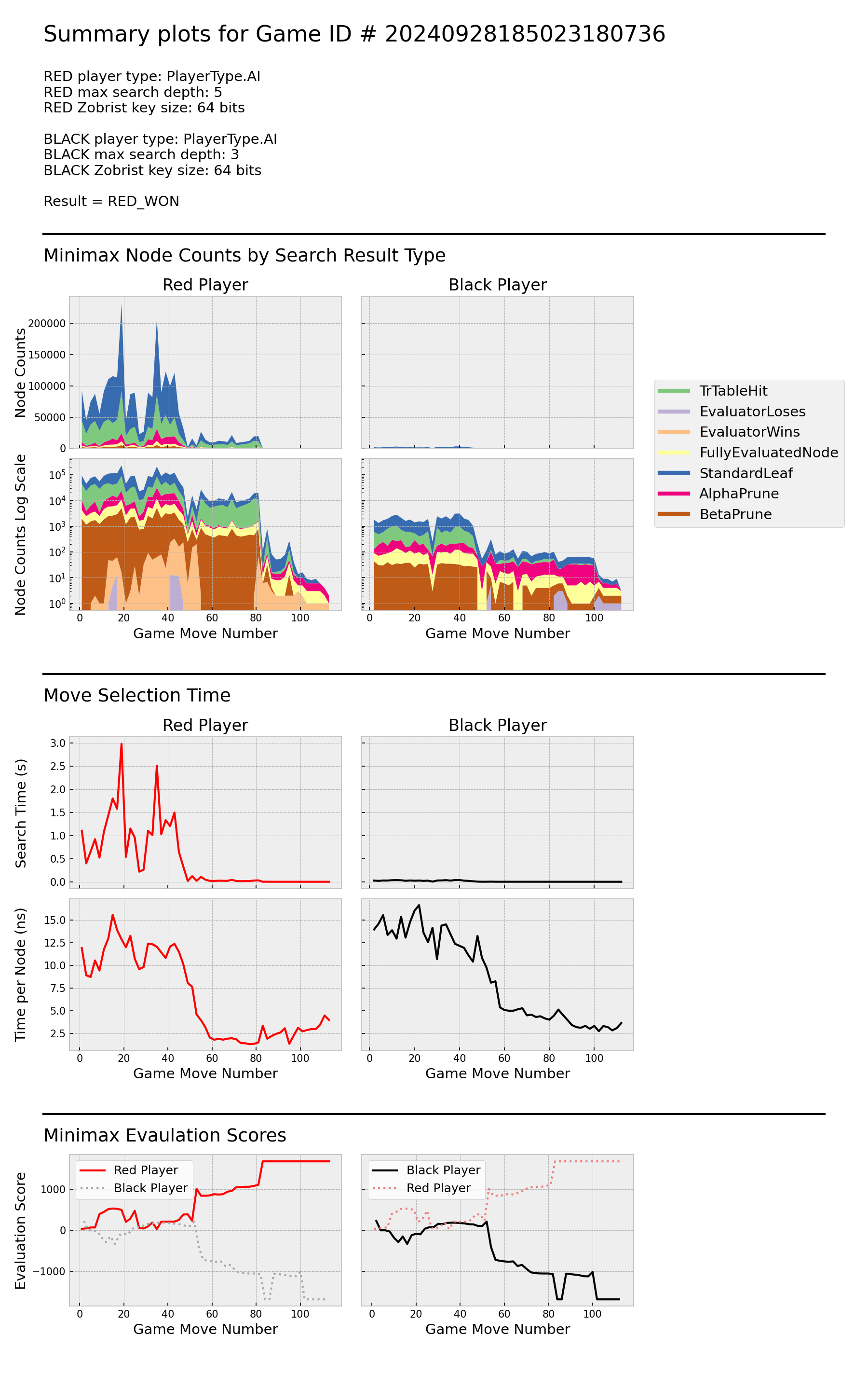 With the the deeper search depth, Red explores ~100x more nodes per move than Black throughout most of the game. Red's search time per node drops significantly from moves 40 - 60, largely due an increase in the ratio of transposition table hits to standard leaves. Black's search time per node also decreases in the same move range, benefitting from significant alpha pruning. Red realizes that its victory is guaranteed around move 85. Black does not realize that its loss is inevitable until move ~102.