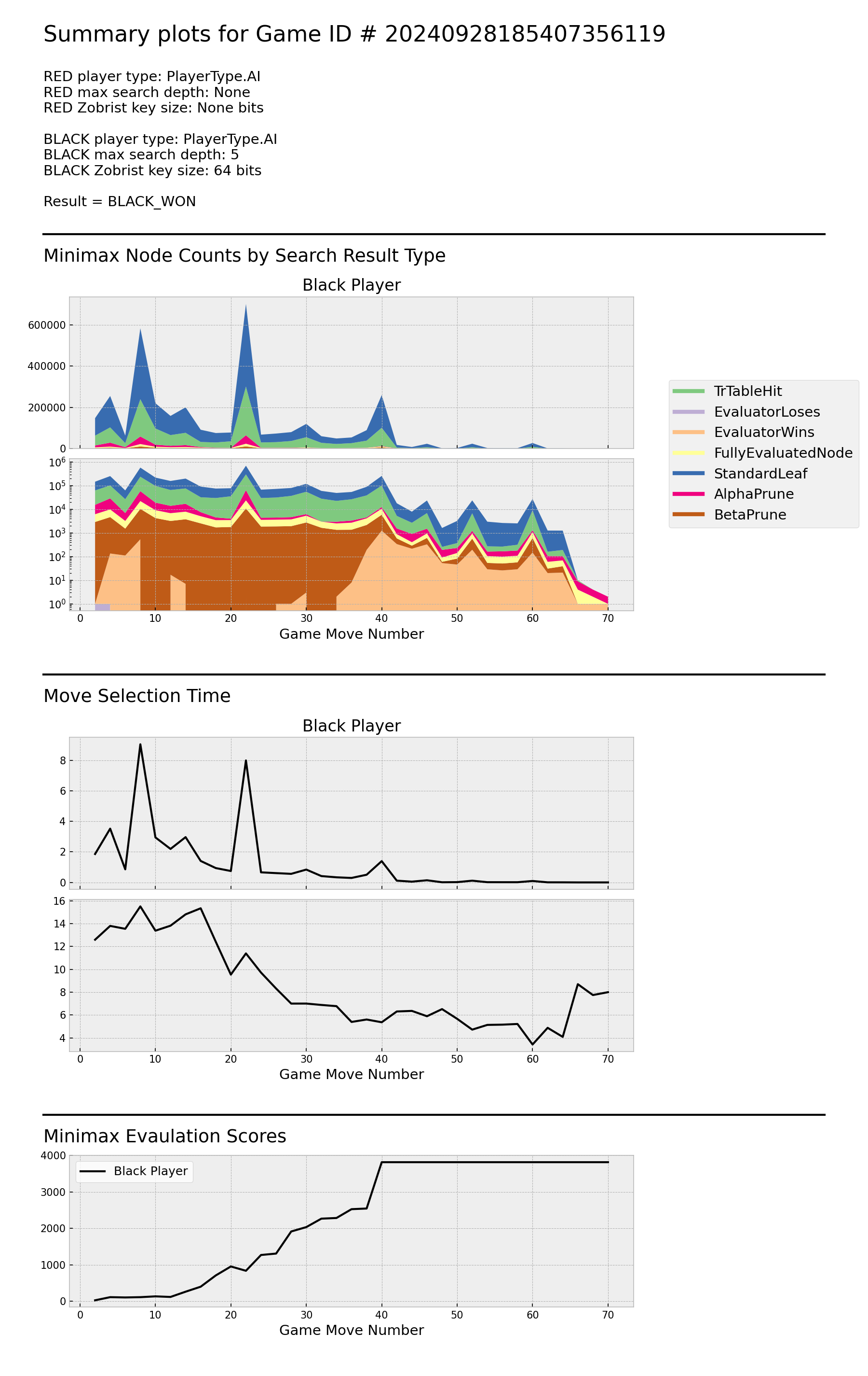 In this game Red randomly selects one of its available moves on each turn, so Minimax data are only generated for Black. Black detects a path to victory at move 40, although the game continues for another 30 moves after this point. This larger than usual number of moves between victory detection and end-of-game is likely due to Red's random decisions which do not match the assumptions of Black's Minimax algorithm. Black's number of nodes explored per move drops dramatically at the same time that it realizes victory is virtually assured due to the discovery of end of game nodes.